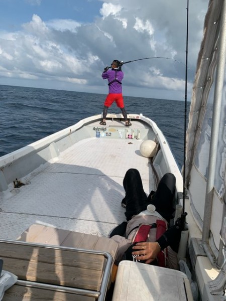 小高様のルアーに何者かのバイトが有るもののフックアップまで至らず 悔しさに落ち込まれているかと思いましたが 本日 朝早くから動き出し朝一便のフライトがたたり うねりと風波の波状攻撃にノックダウン…。