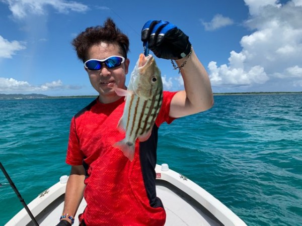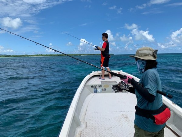 石垣島らしい青空と青い海にご夫妻のテンションは上がるも 大きなキツネフエフキは水面まで姿を見てくれるも船には上がらず…。