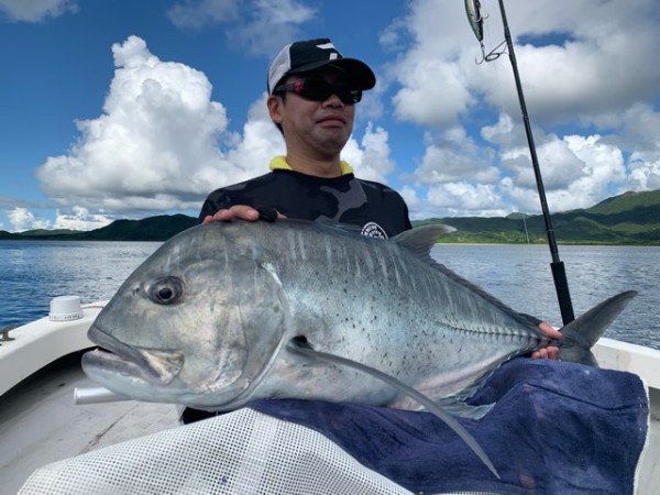 しかし 胡散臭い私のご案内を信じてキャストを繰り返して頂く良介さんのルアーに水柱が上がり 見事にGTをキャッチ!。