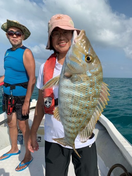 しかしその魚がボートを見て本気を出したか今迄が嘘のように大暴れ そこは百戦錬磨の奥様 慌てずにその魚を水面に引っ張り出すと恋焦がれていたタマン!。