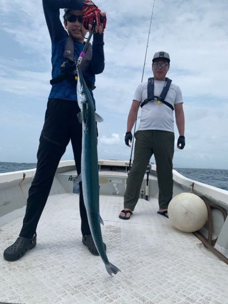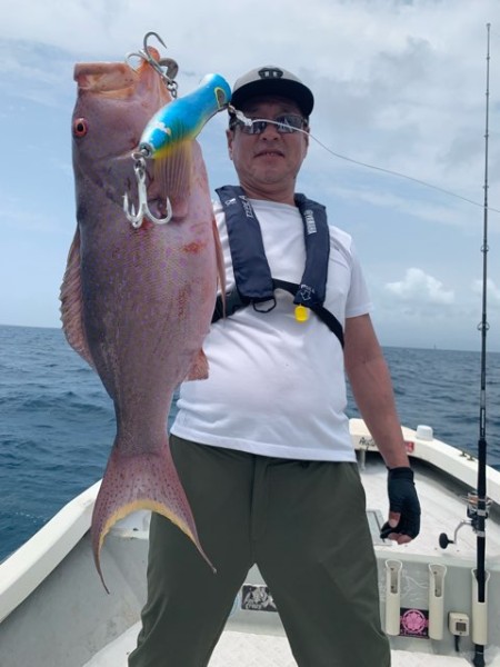事釣時間が1時間となると 船酔いから回復されキャストを始めた息子さんのルアーにスマらしきバイトが有り猛スピードの走りに無念のフックアウト…