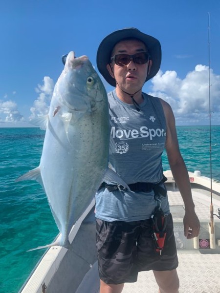 菅原様のロッドは大きく弧を描いたまま 船上の3人はスマを期待していると姿を見せてくれたのはカスミアジ