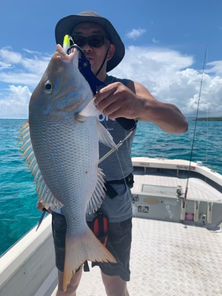 そのナブラへキャストして頂くと 同時にご夫妻のロッドが弧を描き 奥様は残念ながら船べりでツムブリをオートリリース