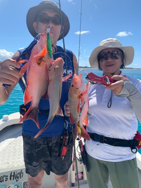 下げ潮の潮流が速いエリアへ入り キャストを始めていただくと奥様 そして菅原様のロッドが続き様に弧を描き お二人が釣り上げた魚達が水面に姿を現すとミミジャー(ヒメフエフキ)一家