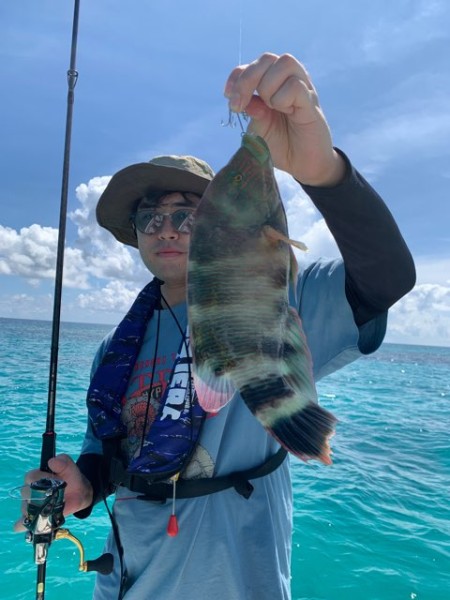 すると黒田様のロッドが弧を描き姿を見せたミツバモチノウオ ツーショットを撮影した直後『いてぇー』と黒田様の声がし振り向くと左手の人差し指にフックが…