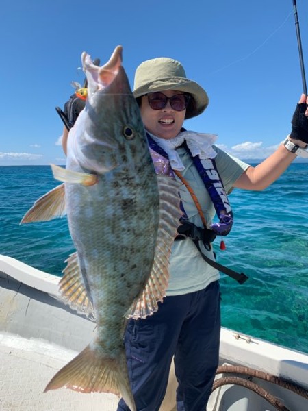 帰港時間時間を迎えるころに上げ汐が動き出し ゴールデンタイムを迎えるとお嬢様のロッドが大きく弧を描き 引き出されるライン 攻防の末海面に姿を現したのはグッドサイズのキツネフエフキ!