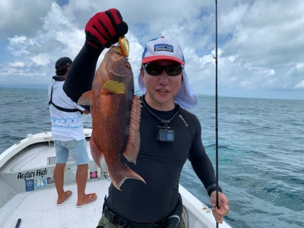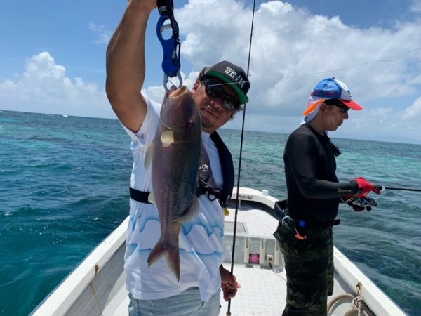good sizeのキツネフエフキを上間様が釣り上げ その勢いでトップを引きずって頂いているとそのルアーをチィエースするロウニンアジらしき魚影。