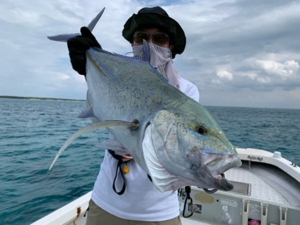 水面下のルアーに素っ気ない態度を見せる魚達ですが 新田様が操るトップのペンシルにカスミアジがヒットし その後さらに大きな水柱が!。