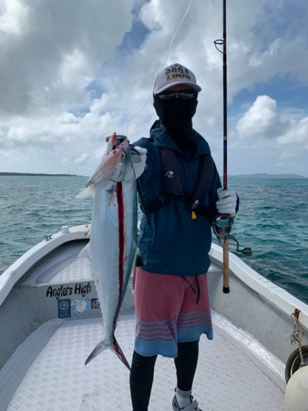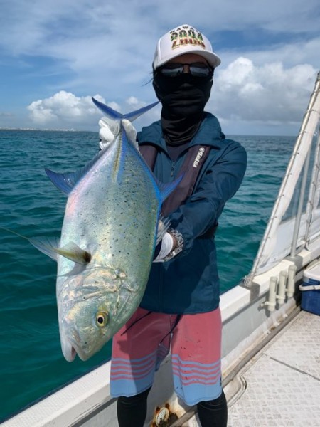 キャストを始めて頂くとルアーに水飛沫が上がり姿を見せてくれたのはイケガツオ マシンガンキャストでキャストしたルアーをチィエイスする10キロほどのロウニンアジはボート側でUターン。