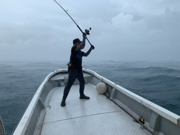 だんだんと平野様の肩が温まり さぁこれから!と気合いが入り始めると同じく真っ黒な雲が上空を覆いルアーの着水も見えない叩きつける大雨…。