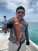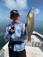 最終日も風が無い朝…潮流でドリフトしようにも下潮の潮止まり…『カスミアジを釣りたい』とのリクエストに応えるべく可能性の有るエリアへすると 八重山のソルトルアーに開眼したか?息子さんのロッドだけが弧を描...