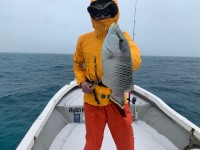 天候は良くならないのですが 魚達の機嫌は良いようでお祭り騒ぎが継続中。菅原様のグッドサイズなカスミアジに続き 奥様のロッドが大きく弧を描き姿を見てくれたのは待ちに待ったグッドサイズなタマン。