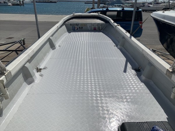 補強に使用したアルミ縞板に遮熱塗料を塗装すると期待以上にデッキの温度が下がり裸足でもOKの状況に驚く程。