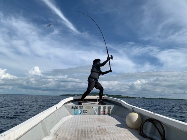 本日は 午前中だけでしたが奥様にもご乗船いただきGTロッドを振っていただく事に